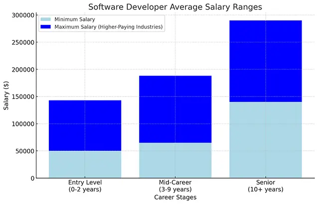 Higher-paying industries like software publishing, finance, and manufacturing tend to boast average salaries approaching $150,000 or more for senior developers.